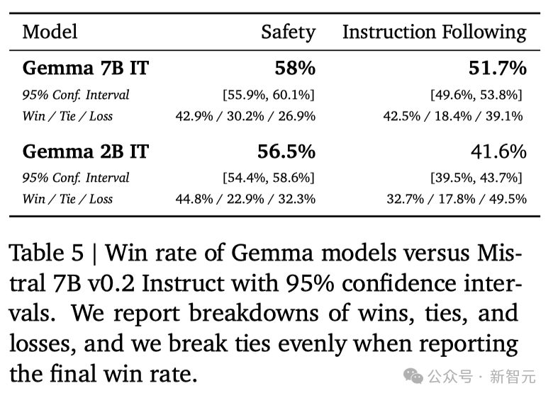 在安全性方面,经过指令微调的Gemma-2B IT和 Gemma-7B IT模型,在人类偏好评估中都超过了Mistal-7B v0.2模型。特别是Gemma-7B IT模型,它在理解和执行具体指令方面,表现得更加出色。