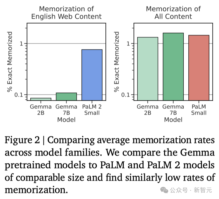 然而,基准测试的制定者评估人类专家的表现为89.8%,而Gemini Ultra是首个超越此标准的模型,这表明Gemma在达到Gemini和人类水平的性能上,还有很大的提升空间。并且,Gemma模型在数学和编程的基准测试中表现尤为突出。在通常用于评估模型分析能力的数学任务中,Gemma 模型在GSM8K和更具挑战性的 MATH基准测试上至少领先其他模型10分。同样,在HumanEval上,它们至少领先其他开源模型6分。Gemma甚至在MBPP上超过了专门进行代码微调的CodeLLaMA 7B模型的性能(CodeLLaMA得分为41.4%,而 Gemma 7B得分为44.4%)。近期研究发现,即便是经过精心对齐的人工智能模型,也可能遭受新型对抗攻击,这种攻击能够规避现有的对齐措施。这类攻击有可能使模型行为异常,有时甚至会导致模型重复输出它在训练过程中记住的数据。因此,研究者专注于研究模型的「可检测记忆」能力,这被认为是评估模型记忆能力的一个上限,并已在多项研究中作为通用定义。研究者对Gemma预训练模型进行了记忆测试。具体来说,他们从每个数据集中随机选择了10,000篇文档,并使用文档开头的50个词元作为模型的prompt。测试重点是精确记忆,即如果模型能够基于输入,精确地生成接下来的50token,与原文完全一致,便认为模型「记住了」这段文本。此外,为了探测模型是否能够以改写的形式记忆信息,研究者还测试了模型的「近似记忆」能力,即允许在生成的文本和原文之间存在最多10%的编辑差距。在图2中,是Gemma的测试结果与体量相近的PaLM和PaLM 2模型的对比。