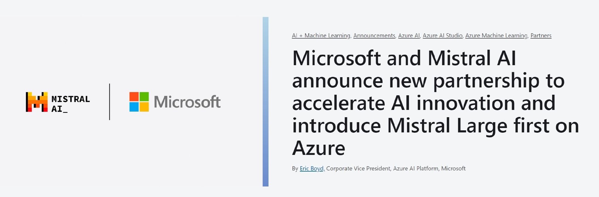 同样在周一,Mistral AI与微软宣布达成了一项新的合作伙伴关系。从公告上来看,双方的合作主要包含三个方面:1、微软向Mistral AI提供开发和运营模型所需的算力;2、Mistral AI的大模型上架微软云服务,供全球用户部署;3、双方将探索合作,为特定客户制作特定模型。