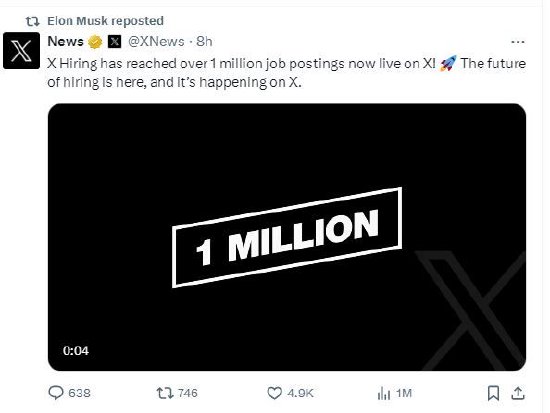 随后,XNews的官方账号也发帖称:“X招聘现在已经达到了超过100万个招聘信息!招聘的未来就在这里,它正在X上发生。”马斯克也转发了这条帖子。