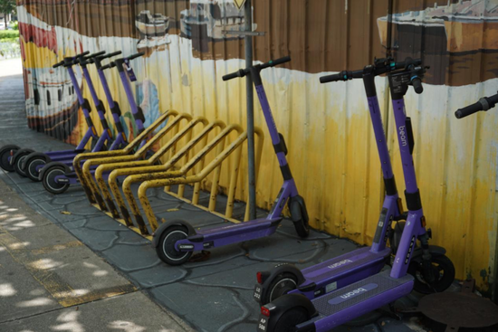 在吉隆坡街头,经常能看到此类共享电动滑板车的集中停靠区里,紫色的车身贴着可供扫描的二维码,用户扫码即可使用。除此外,还有此类红色的电动共享自行车,同样也是扫码使用。
