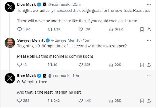 马斯克发帖称:“特斯拉新一代Roadster跑车的生产设计已完成,并在年底推出,目标是明年发货。我认为它有可能成为有史以来最令人兴奋的产品演示。”马斯克接着说:“今晚,我们从根本上提高了新特斯拉跑车的设计目标。再也不会有这样的车了,如果你能称之为车的话。”