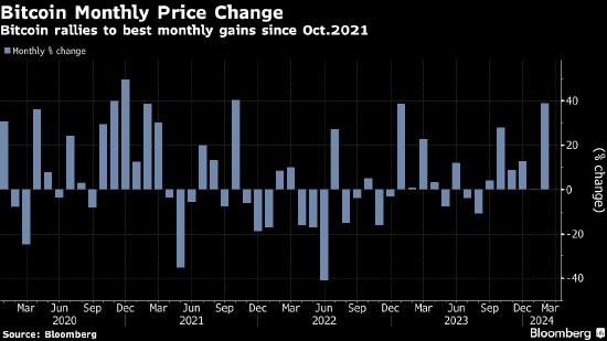 1月初美国推出现货比特币ETF引发购买热潮,并削弱了对于美联储可能将利率维持更高更久的担忧。下一次比特币“减半”将于4月进行,多头乐观情绪升温,认为其很快有望突破2021年11月触及的近69,000美元的纪录高位。
