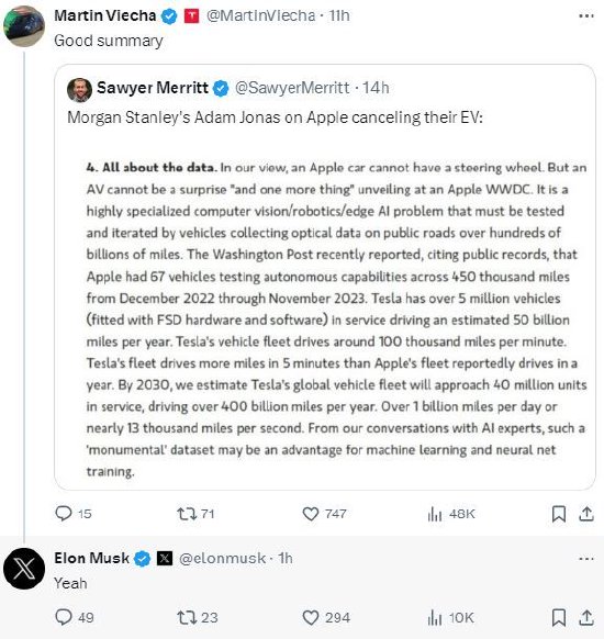 特斯拉CEO埃隆·马斯克周四借一位分析师之口再次对苹果放弃造车计划发表了评论。摩根士丹利分析师亚当·乔纳斯在一份报告中写道:“一切都是关于数据:在我们看来,苹果汽车不可能是一个惊喜,也不可能是是苹果在全球开发者大会上发布的‘又一个东西’。这是一个高度专业化的计算机视觉/机器人/边缘人工智能问题,必须由在数千亿英里的公共道路上收集视觉数据的车辆进行测试和迭代。”