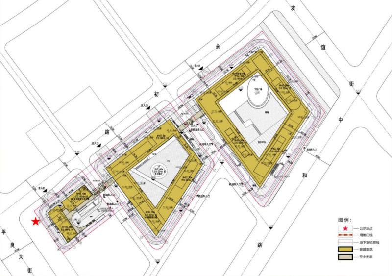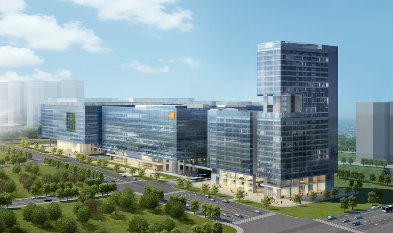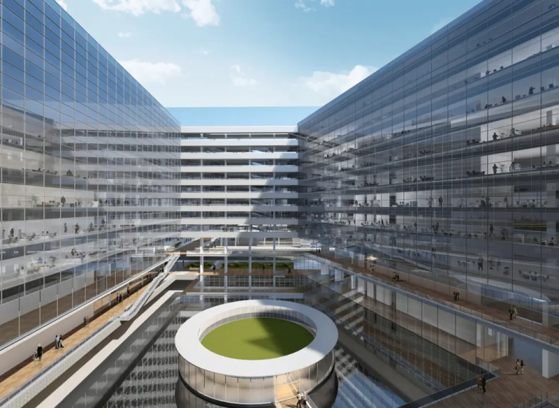 大楼合围形成四边形,中庭内建有一座透明圆形建筑,从空中看,整座建筑仿佛一个“回”字。