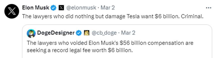 马斯克周末在X平台上阴阳怪气,引用一则推文并评论,那些除了毁掉特斯拉之外一事无成的律师,竟然要求60亿美元的报酬,这是一种犯罪。此事缘起于一个月前,一个律师团队代表特斯拉股东Richard Tornetta向马斯克提起诉讼,要求向特斯拉返还公司董事会在2018年允诺的高额薪酬包。