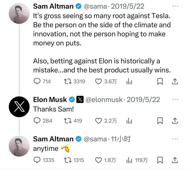 奥特曼回复了2019年与马斯克的推文。