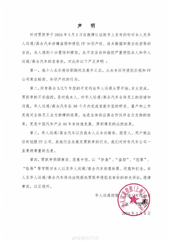 对此,高合汽车发一份声明回应,称不存在任何抄袭和侵犯FF公司商业秘密、知识产权的行为,也不存在不正当竞争。具体如下: