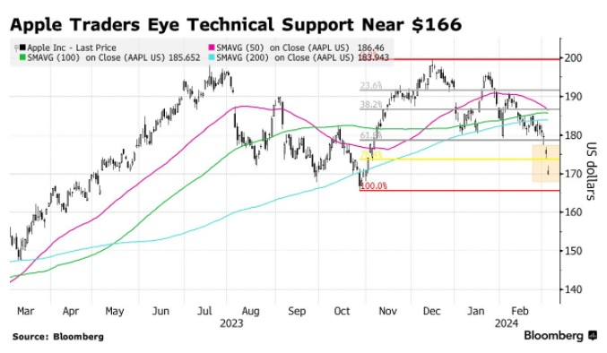 周二,苹果股价跌破重要心理关口,自去年8月以来首次进入技术性调整,交易员正密切关注该股走势。该股上周未能守住180美元的支撑位,并在周二盘中多处跌至170美元以下。Strategas Securities ETF和技术策略董事总经理Todd Sohn表示,跌破这一水平并保持在该水平可能预示着该股将回调至去年10月低点165.67美元。