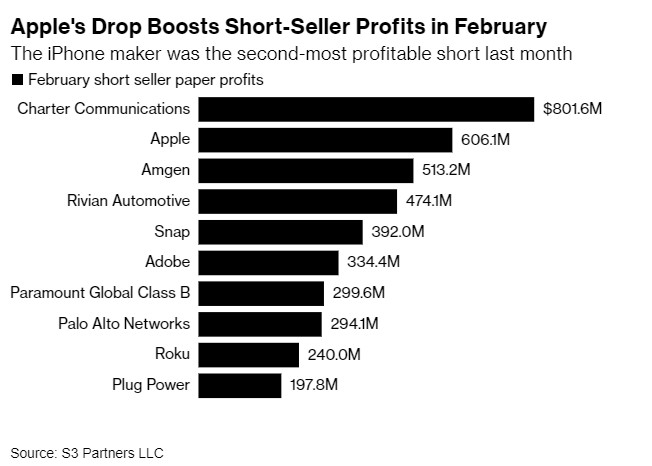 因此,空头正在大举出击。根据数据分析公司S3 Partners的数据,今年2月,苹果成为美股中空头获利第二多的做空对象,账面利润达6.06亿美元。