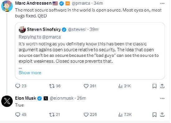 前微软高管、现任风投公司Andreessen Horowitz董事会合伙人的Steven Sinofsky评论称:“值得注意的是,你们肯定知道,这是与安全性相关的反对开源的经典论点。开源不安全的想法,因为‘坏人’可以看到源代码来利用弱点。闭源可以防止这种情况。这是完全错误的。”
