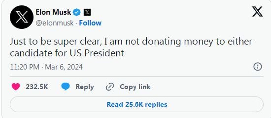 特斯拉CEO埃隆·马斯克周三表示,他不会向任何一位总统候选人捐款。马斯克在他的社交媒体网站X上发帖称:“我要非常明确地说,我不会给任何一位美国总统候选人捐款。”