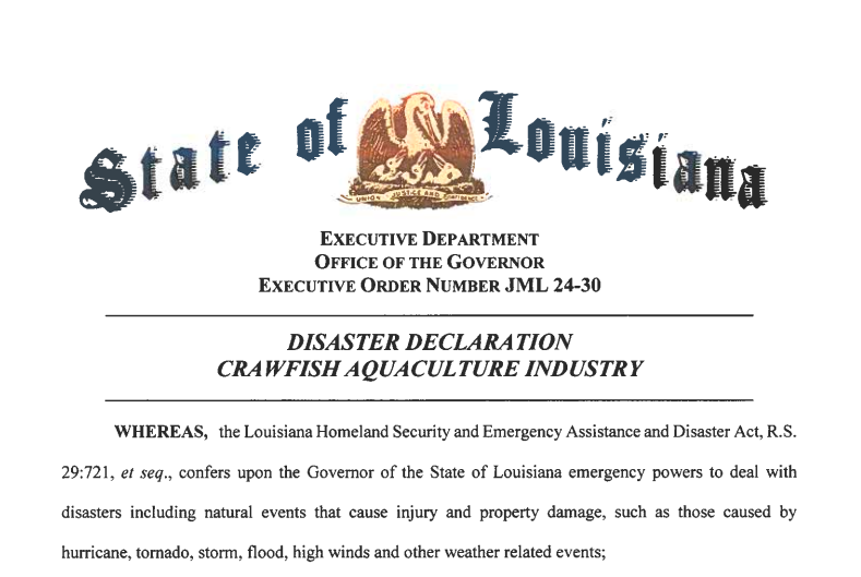 兰德里在周三的一份书面声明中指出,“路易斯安那州的所有36.5万亩小龙虾都受到了这些情况的影响。这就是我发布灾难声明的原因。小龙虾产业现在亟需一切可以得到的支持。”
