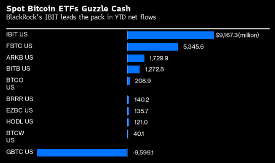 自1月获得SEC批准以来,投资者纷纷涌入现货比特币基金。这10只基金今年已净赚89亿美元。剔除先前基金结构中存在的Grayscale现货比特币基金,新获批的基金持有约260亿美元的资产。
