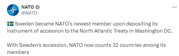 当地时间周四,瑞典正式加入了北约(NATO),成为其第32个成员国,距瑞典首次申请加入该军事联盟已过去了近两年时间。当天早些时候,瑞典政府召开新闻发布会,表示同意瑞典加入北约。瑞典首相克里斯特松向北约文件保管国美国国务卿布林肯递交了瑞典加入北约的文件,这是入约的最后一个步骤。