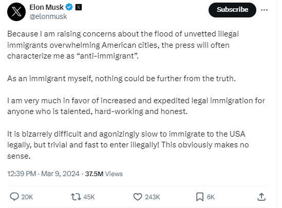 特斯拉CEO埃隆·马斯克周末在X平台上发帖,驳斥美国主流媒体给他贴上的“反移民”标签。马斯克写到:“因为我提出了对大量未经审查的非法移民涌入美国城市的担忧,媒体经常将我描述为“反移民”。