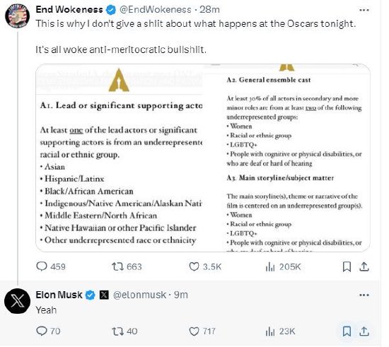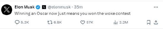 特斯拉CEO埃隆·马斯克在X上发帖吐槽,认为现在的奥斯卡奖已经变味,不再是为了选出真正的好电影,而变成了“觉醒主义”的表演舞台马斯克写道:“现在赢得奥斯卡奖就意味着你赢得了觉醒竞赛。”