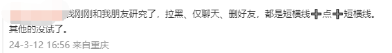 有网友表示,“被拉黑、仅聊天、删好友,都是短横线”“朋友圈全都屏蔽仅限自己可见,也会有这个线”“拉黑和仅聊天是短线,长期不发朋友圈是长线”。