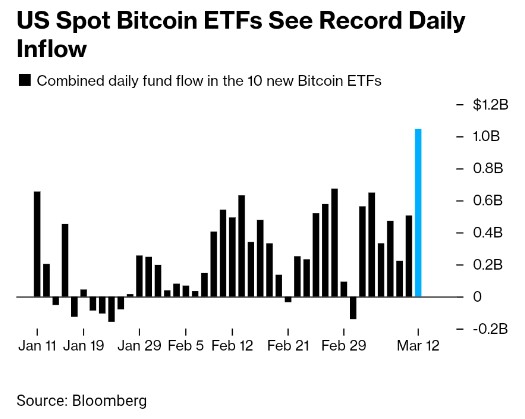 受与比特币相关的美国ETF创纪录资金流入的推动,比特币在六天内第四次创下历史新高。周三,这一全球最大的加密货币一度达到73664美元的高点,随后小幅回落,截至发稿,交易价格约为72909美元。与此同时,汇编数据显示,周二美国现货比特币ETF的日净流入首次突破10亿美元,贝莱德的IBIT创下了8.49亿美元的单日净流入纪录。
