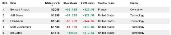 今年以来,特斯拉的市值急剧下滑,使其市值蒸发了2450多亿美元,并跌出了标普500指数前十大公司之列。这也让马斯克失去了“世界首富”的地位,截至周三收盘,他的净资产据估计为1840亿美元,在富豪榜上排名第三,落后于路威酩轩CEO伯纳德·阿尔诺和亚马逊创始人杰夫·贝佐斯。