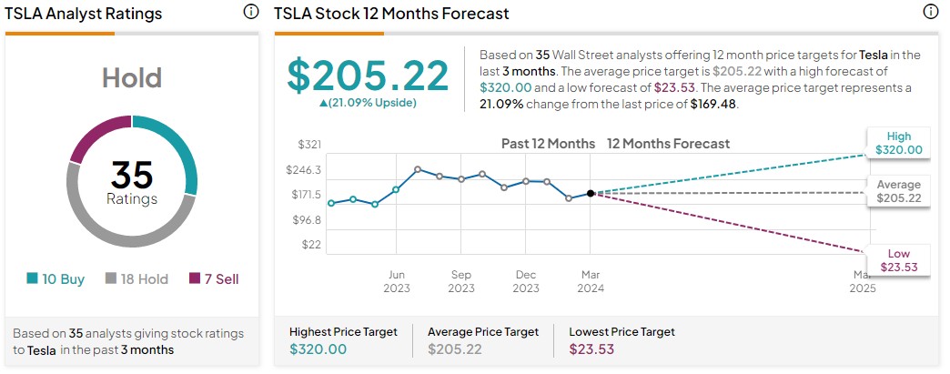 总体而言,华尔街分析师对特斯拉的看法存在分歧。根据TipRanks的数据,有10位分析师予特斯拉“买入”评级,18位予“持有”评级,7位予“卖出”评级,共识评级为“持有”,平均目标价为205.22美元,较当前水平高出21%。