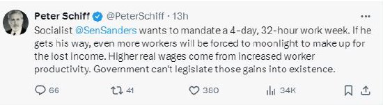 知名经济学家彼得·希夫在社交媒体上发帖称:“桑德斯希望强制实行每周工作4天、32小时的制度。如果他如愿以偿,将会有更多的工人被迫做兼职来弥补失去的收入。更高的实际工资来自于工人生产率的提高。政府不能通过立法使这些收益存在。”