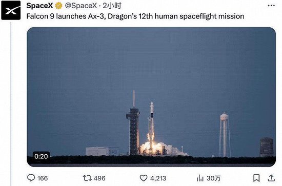 2024年1月19日,Space X再次成功进行私人飞行任务。此次任务由美国一家商业航天公司发起。4位私人宇航员搭载龙飞船,借由猎鹰9号火箭推送升空。