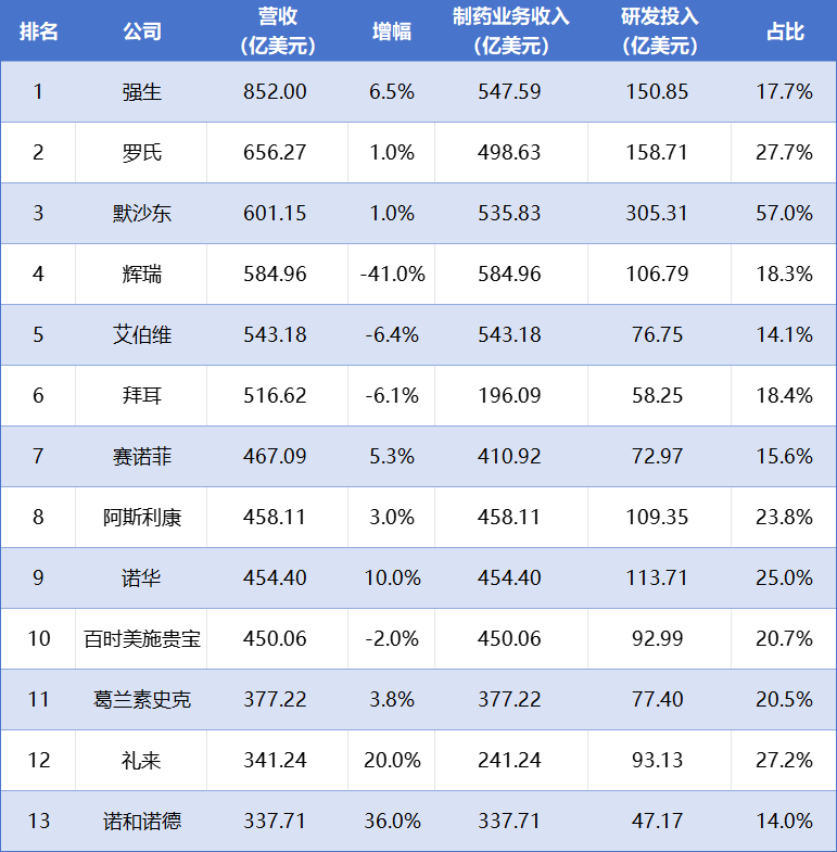 具体来看,如果按公司总收入排名,全球药企TOP10分别为强生、罗氏、默沙东、辉瑞、艾伯维、拜耳、赛诺菲、阿斯利康、诺华和BMS。