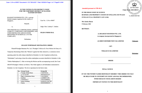 从去年8月开始,Shein已经在美国和英国多个法庭申请到TRO,阻止Temu平台上的商家销售涉嫌侵犯Shein版权的服饰与商品。仅仅是过去三个月时间,Shein就在英国和美国法院申请到5个针对Temu商家的TRO,涉及到上百件涉嫌侵权产品,并且冻结了涉事商家的账户。