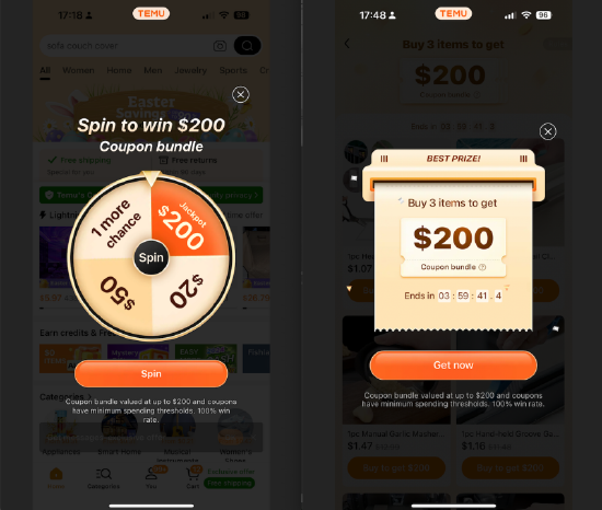 不得不提的是,拼多多还将在中国那套五花八门的打折手段平移到了海外。中国有“砍一刀”,海外有“轮盘优惠”。每次用户打开Temu应用的时候,都会看到轮盘抽奖,轻松就能获得从20美元到200美元的折扣券。