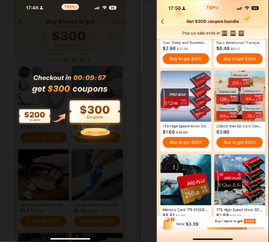 当然,用户需要购买一定额度的商品才能获得折扣券,应用甚至会不断催促用户在几分钟之内尽快完成支付,才能享受更多的折扣。等用户完成支付之后,才发现这些折扣券是分成多次的“满100减20”,再次促使用户继续多次消费。这种花样繁多的连环折扣,已经超过了美国同行的想象空间。