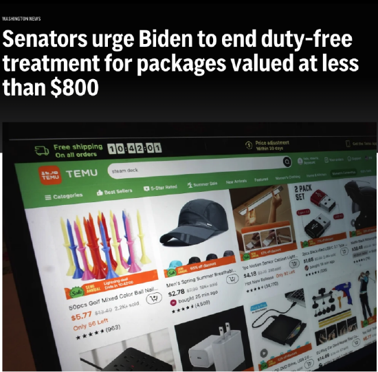 上月底,美国参议院几位议员再次督促美国总统拜登通过行政命令,对涌入美国的中国小额电商产品采取遏制措施,结束免关税待遇。按照美国目前的关税政策,海外商品销售到美国,只要价值在800美元以下就免征关税。