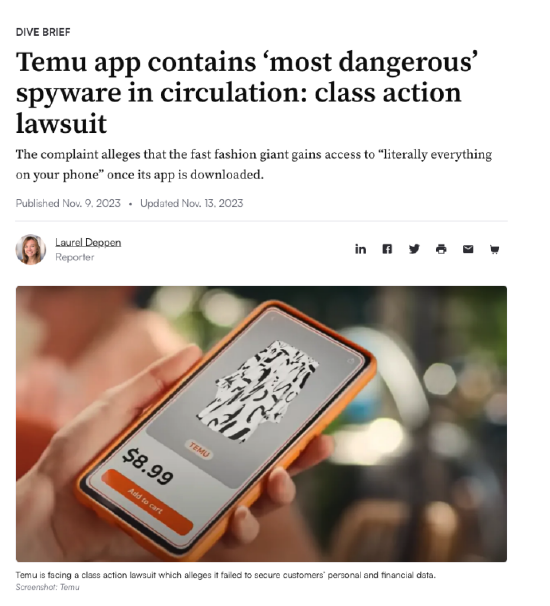 虽然此举并不涉及和影响Temu应用,但在过去几个月,Temu已经面临着多起与用户数据相关的集体诉讼。这些集体诉讼指称Temu“恶意使用欺骗与不道德手段”获取用户数据,在如何使用户数据方面误导消费者,侵犯了用户的隐私权益。