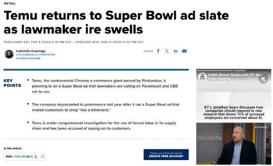 然而,Temu凶猛扩张的背后,也面临着诸多政策风险。过去一年时间,中国跨境电商平台已经逐渐引起了美国政界的高度关注,而Temu连续两年在最受瞩目的超级碗高调投放广告,更让他们成为了美国政界人士眼中的中国电商头号威胁。