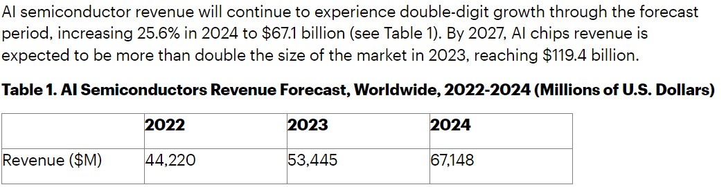 根据市场研究机构Gartner最新预测,到2024年AI芯片市场规模将较上一年增长 25.6%,达到671亿美元,预计到2027年,AI芯片市场规模预计将是2023年规模的两倍以上,达到1194亿美元。