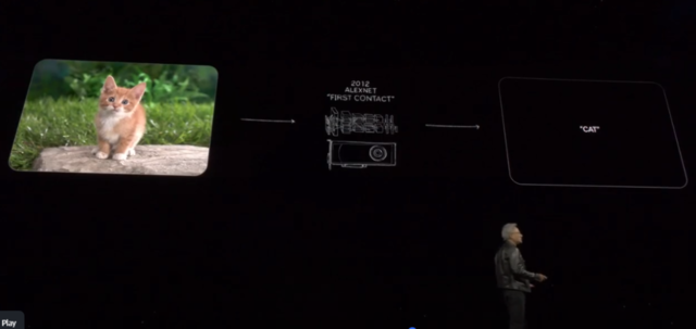 这是你们知道的,这是2012年的第一次接触,Alex Net。你把一只猫放进这台电脑,它出来说猫。你把100万个数字通过三个通道,RGB。这些数字对任何人来说都毫无意义。你把它放进这个软件,它会压缩它,减少它。它把它从一百万维减少到三个字母,一个向量,一个数字,它是泛化的。你可以有不同种类的猫,你可以有猫的前面和后面。你看着这个东西,你说,难以置信。你的意思是任何猫?是的,任何猫。它能够识别所有这些猫。我们意识到它是如何做到的,系统地,结构性地,它是可扩展的。你可以做得有多大?嗯,你想做多大就做多大。所以我们想象这是一种全新的编写软件的方式。今天,如你所知,你可以输入单词C,A,T,出来的是一只猫。它走了另一条路。我对吗?难以置信。怎么可能?就是这样。怎么可能你拿了三个字母,却从中生成了一百万像素,而且它有意义。那正是奇迹。