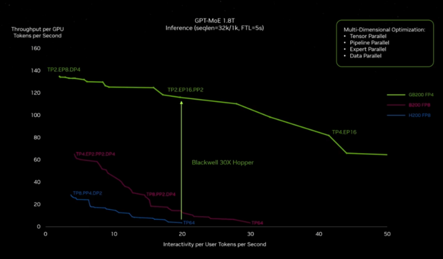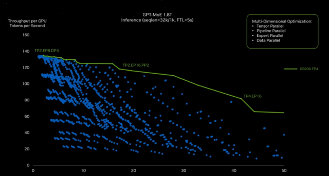 一些优化解决方案必须去找出是否使用张量并行、专家并行、流水线并行或数据并行,并将这个巨大的模型分布在所有这些不同的GPU上,并保持你需要的性能。如果没有NVIDIA GPU的可编程性,这个探索空间将是不可能的。所以我们可以,因为有了CUDA,因为我们有如此丰富的生态系统,我们可以探索这个宇宙并找到那个绿色的屋顶线。你会发现你得到了TP2、EPA、DP4,这意味着在两个GPU上进行2个并行,8个专家并行,4个数据并行。注意在另一端,你有4个张量并行和16个专家并行。这个软件的配置、分布,它是一个不同的运行时,会产生这些不同的结果。你必须去发现那个屋顶线。好吧,这只是一个模型。这只是一个计算机配置。想象一下全世界正在创造的所有模型和所有不同的系统配置。