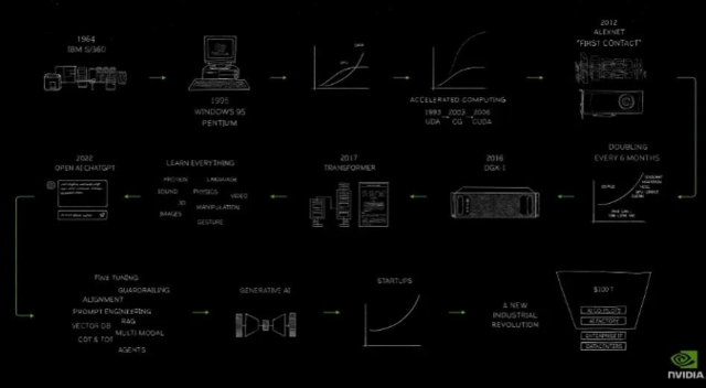 绝对有一些事情正在发生。正在发生一些事情。整个行业正在转型,不仅仅是我们的行业,因为计算机行业,计算机是当今社会最重要的工具。基本上的转型和计算影响到了每个行业。但我们是如何开始的?我们是如何达到这里的?我为你们准备了一个小漫画。确切地说,我画了这一页。这是NVIDIA的旅程,始于1993年。这可能就是剩下的演讲内容。1993年,这是我们的旅程。我们成立于1993年。沿途发生了几个重要事件。我只是简单地强调了一下。