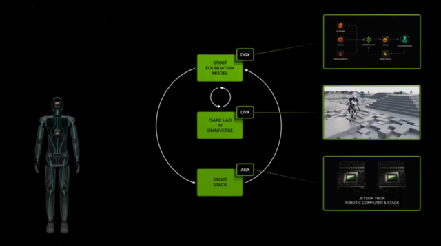我们开始做一些真正伟大的工作,在下一代机器人技术中,很可能是类人机器人。我们现在拥有了必要的技术,正如我之前所描述的,下一代机器人技术很可能是一种通用的人类机器人。我们知道这一点,因为我们有更多的模仿训练数据可以提供给机器人,因为我们是以非常相似的方式构建的。很可能类人机器人在我们的世界中会更加有用,因为我们创造了一个我们可以互操作并良好工作的世界。我们设置的工作站、制造和物流,都是为人类设计的。所以这些类人机器人在部署时可能会更加高效,而我们正在创建的,就像我们对其他机器人一样,从基础模型开始,学习观看视频、人类图像、人类例子。它可以是视频形式的,也可以是虚拟现实形式的。然后我们创建了一个名为Isaac Reinforcement Learning Gym的健身房,这个健身房允许类人机器人学习如何适应物理世界。然后是一个令人难以置信的计算机,这个计算机将进入一个机器人或类人机器人,称为Thor。它被设计为变换器引擎。我们将其中的几个组合成一个视频。这是你真的会喜欢的东西。来看看。