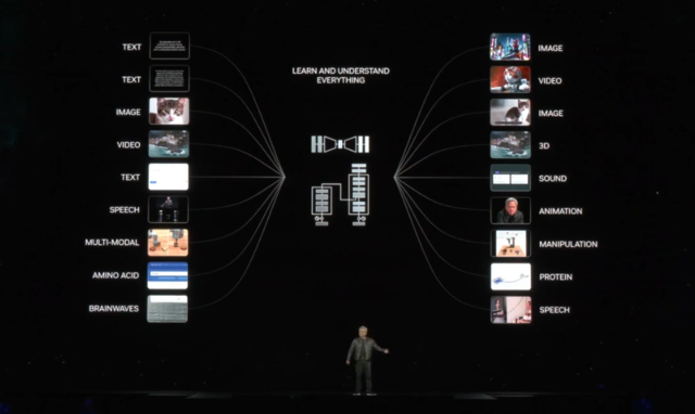 而在这里,就在十年后,我们识别文本,我们识别图像,我们识别视频和声音,我们不仅识别它们,我们理解它们的含义。这就是为什么我可以和你聊天的原因。它可以为你总结。它理解文本。它不仅识别英语,它理解英语。它不仅识别像素,它理解像素。你甚至可以在两种模态之间进行条件设置。你可以用语言来条件图像,并生成各种有趣的事情。如果你能理解这些东西,你还能理解你数字化的其他东西吗?我们之所以从文本和图像开始,是因为我们数字化了这些东西。但是我们还数字化了什么?事实证明,我们数字化了很多。蛋白质、基因和脑波。只要你能数字化的东西,只要它们的结构,我们可能就能从中学到一些模式。如果我们能从中学到模式,我们可能就能理解它的含义。如果我们能理解它的含义,我们可能就能生成它。所以,生成性AI革命就在这里。
