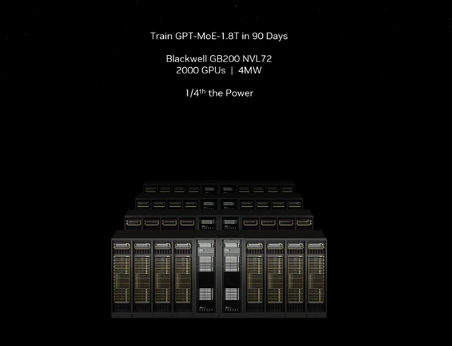 如果用Hopper来做,可能需要8000个GPU,并且会消耗15兆瓦。8000个GPU和15兆瓦,它会需要90天,大约三个月的时间。