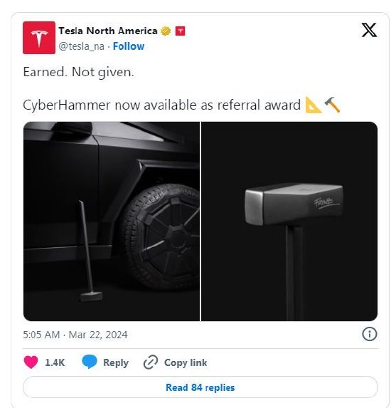 特斯拉公司在其引荐购车奖励计划中增加了一款限量版“赛博锤”(Cyber Hammer)作为奖品,其灵感来自于Cybertruck。拥有3.5万引荐积分的用户可以用这些积分来兑换这款锤子,该公司计划只生产800把。锤头酷似Cybertruck的棱角结构,并且刻有特斯拉首席设计师弗朗茨·冯·霍兹豪森的签名。