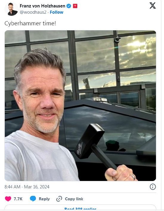 霍兹豪森本人也在X上发布了一张自己手持“赛博锤”的照片。