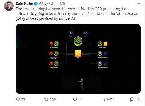 一位X用户分享了一段黄仁勋在英伟达GTC大会上演讲的视频片段,并评论称:“本周我看到的最疯狂的事情是,英伟达CEO预测,未来软件将由一群聊天机器人编写,并由超级人工智能监督。”