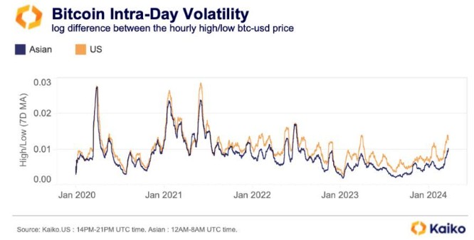 研究公司Kaiko在报告中表示,一项追踪比特币每小时高低价格差异的指标显示,比特币在美国比亚洲交易时段的波动更大;因此,波动性“在美国开盘时间更为集中”。
