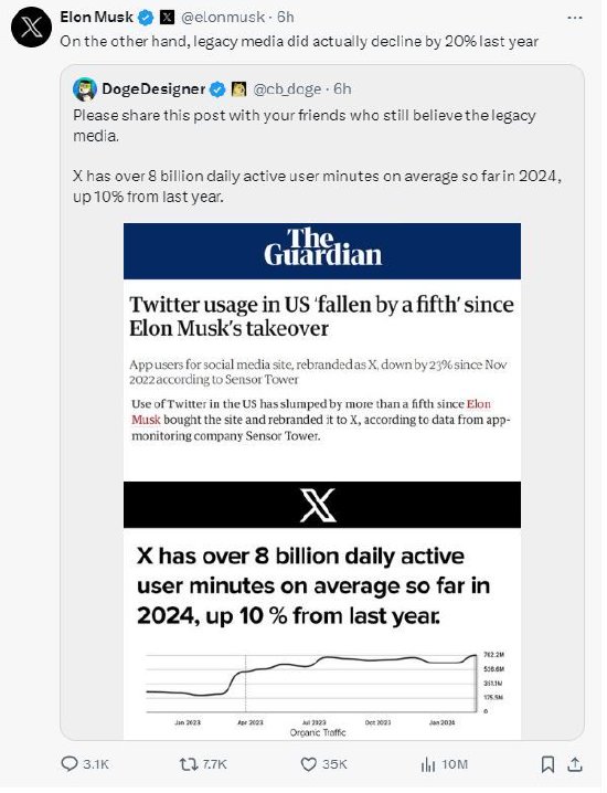 马斯克的粉丝“DogeDesigner”分享了这篇报道的截图,并指出,事实是2024年迄今为止,X的平均日活跃用户使用时间超过80亿分钟,比去年增长了10%。