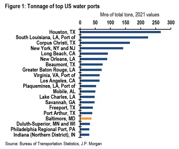 摩根大通分析师Michael Feroli和Daniel Silver在当日的一份报告中指出,巴尔的摩港在美国港口中的货物吨位排名第17位。他们强调,2021年该港的货运吨位仅占美国水域港口总吨位的约1.6%,而且很多原本计划经过这个港口的贸易活动将改道其他港口。