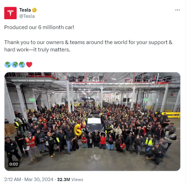 不过,情况可能并没有分析师想象的那么糟糕。特斯拉上周五在X上发帖官宣,第六百万辆特斯拉已经生产出来。
