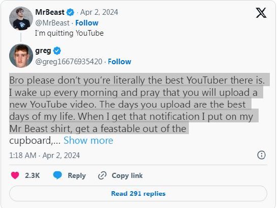 当然,大部分网友都意识到这是一个愚人节的玩笑,但确实有人上当了,恳求MrBeast不要离开YouTube。