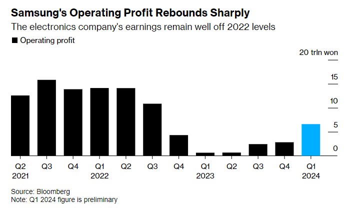 三星电子2024年第一季度利润大幅反弹,反映出该公司关键的半导体部门出现好转,以及Galaxy S24智能手机销量强劲。数据显示,这家全球最大的存储芯片制造商周五公布的初步营业利润约为6.6万亿韩元(合49亿美元),同比大增931.3%,分析师预期为5.37万亿韩元。这一增长结束了自2022年第三季度开始的连续季度下滑。